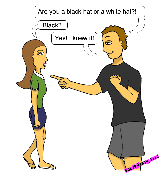 This post is dedicated to my sweet little cousin who is like a little sister to me. She was asked out by the boy she likes and she said yes! It reminded me of when Randall and I started dating about seven years ago. He would interrogate me with unusual questions like this one, “Are you a Black Hat or a White Hat?” (You can see why I found him very interesting.) Randall taught me that there are different kinds of hackers, such as black hats and white hats. Black hats hack to exploit for malicious intentions while white hats exploit to test or improve code. The good thing is doing either could get you a job after serving some jailtime. 😀