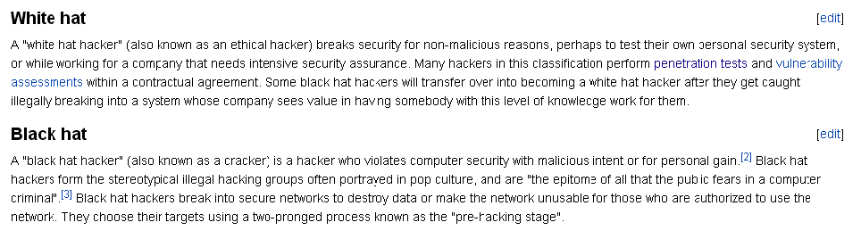 Just two kinds of hackers. Excerpt from Wikipedia. http://en.wikipedia.org/wiki/Black_hat_hacking#Black_hat